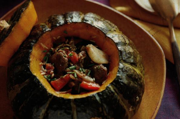 - Remove stew from heat, carefully fill squash to capacity, and set lid in place. Bake until just tender inside when pierced, 70 to 90 minutes. Spoon any remaining stew into loaf pan, cover and bake 1 hr.