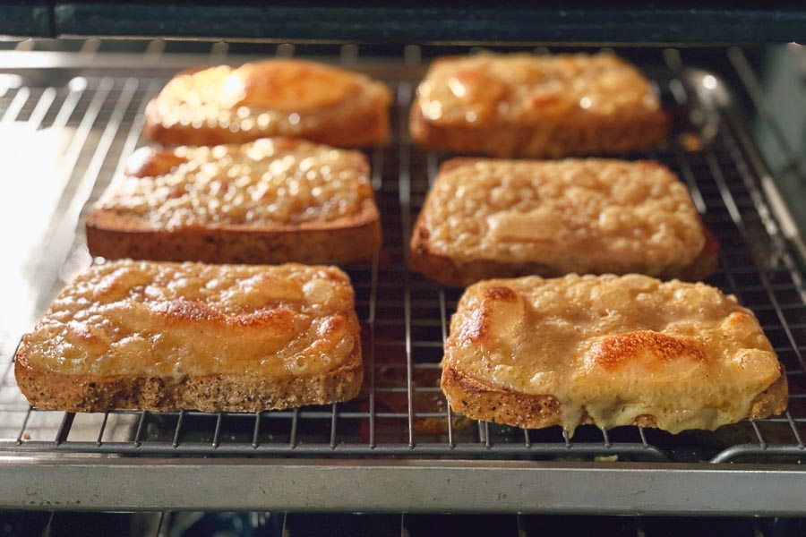Generously ladle the beer and cheese mixture onto the toast. Truth? Some people stop there. In some kitchens rarebit is served as a cheesy sauce over toast, but we like it hot! So, toss it under the broiler for a few minutes. You won’t be sorry. The cheesy goodness will seep into the toast and top of will blister under the broiler, creating a delightful crust.