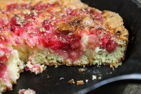 Tart, sweet and dramatically red, rhubarb never tasted so good as in this rustic cake with lemon thyme. The cake is moist and fluffy on the inside with a slight crisp on the outside edge. The sharpness of the rhubarb combined with the delicate pungency of the lemon thyme make this a most wonderful way to take advantage of an abundant rhubarb harvest.