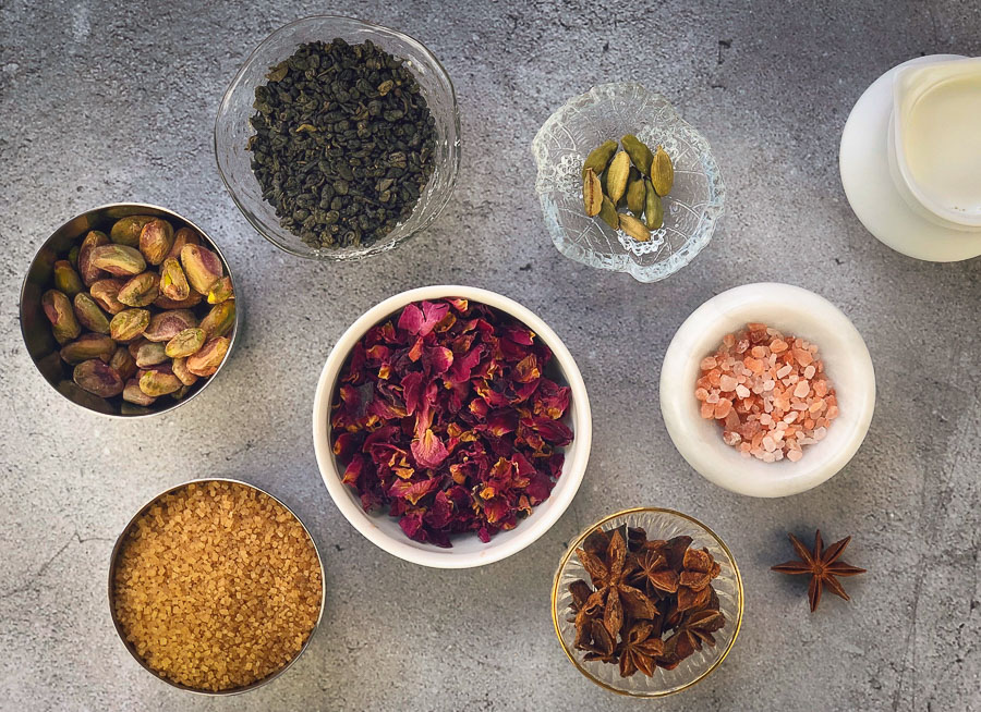 The result was unlike any cup of tea I’ve ever had. The tea is creamy, floral and scented with cardamom, star anise and roses — with just a little Himalayan pink salt. We garnished the tea with pistachios, rose petals and a star anise, making it a tasty afternoon treat. The marriage between sweet and salty is just perfect.