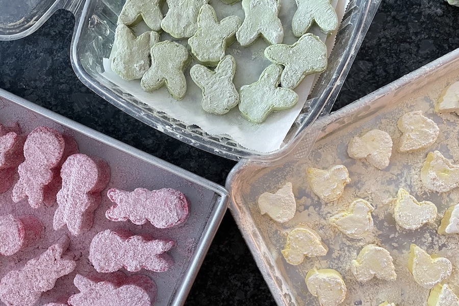 - Turn the marshmallows onto a board and cut them into desired shapes, dipping the cutter into the dusting mixture between cuts. Dust again with more of the powdered sugar/cornstarch mixture. Arrange your parade and enjoy!