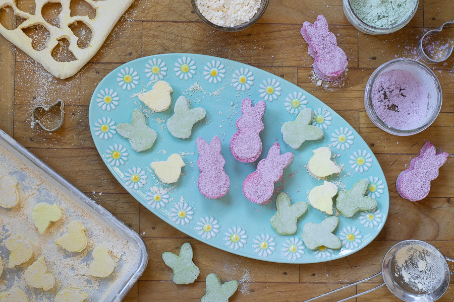 Nothing says “spring” like a pastel Peep parade. These rustic cuties are fun and super easy to make. Kids young and old will have fun messing around with the powdered sugar and sticky cut-outs. Plan ahead for parade day, as each batch of marshmallows needs to dry overnight before cutting. Our go-to marshmallow recipe comes together quickly and note you’ll need to make three batches if you want to include all the colors and flavors shown here. Each batch makes one 9×11 tray.