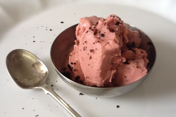 - Pour the ice cream through a fine mesh strainer into a clean, chilled metal bowl and stir in the strawberries, omitting any juice that may have resulted in the bottom of the bowl, the remaining 1/2 tsp. of the urfa biber, the beet powder (if using), and the salt. Place the bowl over another container filled with ice to cool it quickly. Stir occasionally as it cools. At this point, the mixture can be covered and chilled in the refrigerator for up to 48 hours before being churned.