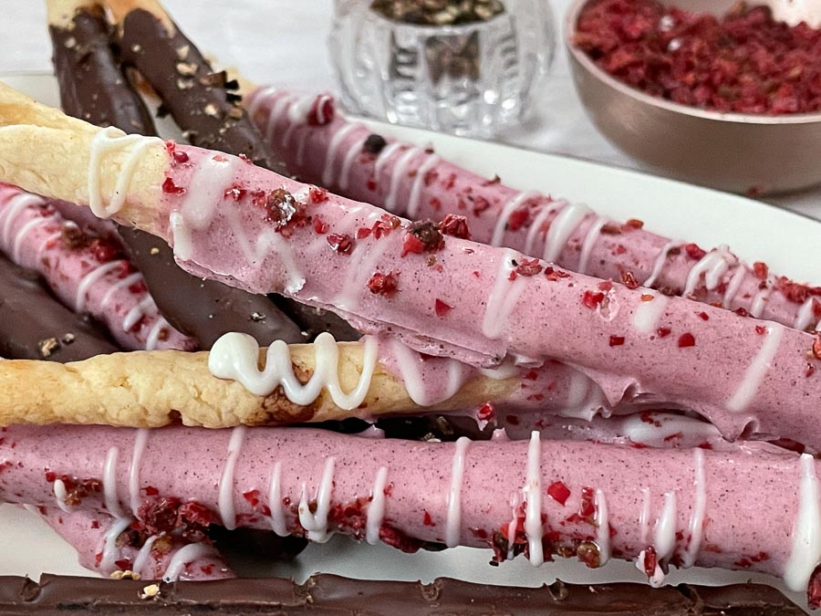 Pocky is fun to eat, fun to make, and fun to spice! Inspired by Susan Spungen’s recent recipe post, homemade Pocky jumped to the top of our recipe list and we’re glad we didn’t wait. This recipe follows hers pretty much to the letter, except that we went all-out with a Valentine’s Day spicing and decorating theme. White chocolate bloomed pretty in pink with the addition of beet powder, kissed with a sprinkle of pink peppercorns. Set aside a little bit of white chocolate before you tint the whole batch so you can add a fancy swirl of white over the whole cookie.